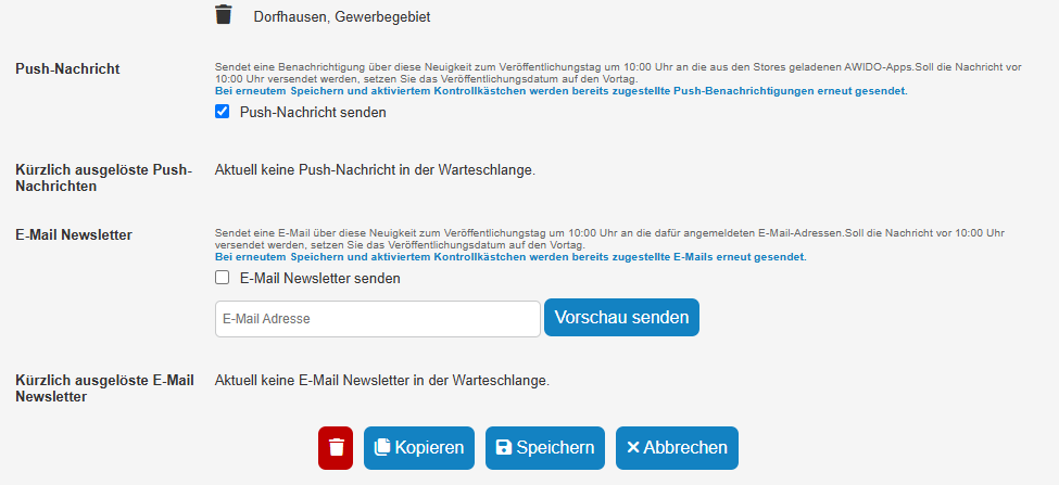 Bei besonders dringenden Mitteilungen kann der Haken bei der Push-Nachricht gesetzt werden. Durch das Anwählen dieser Checkbox werden die betroffenen Bürger aktiv auf die Meldung aufmerksam gemacht.