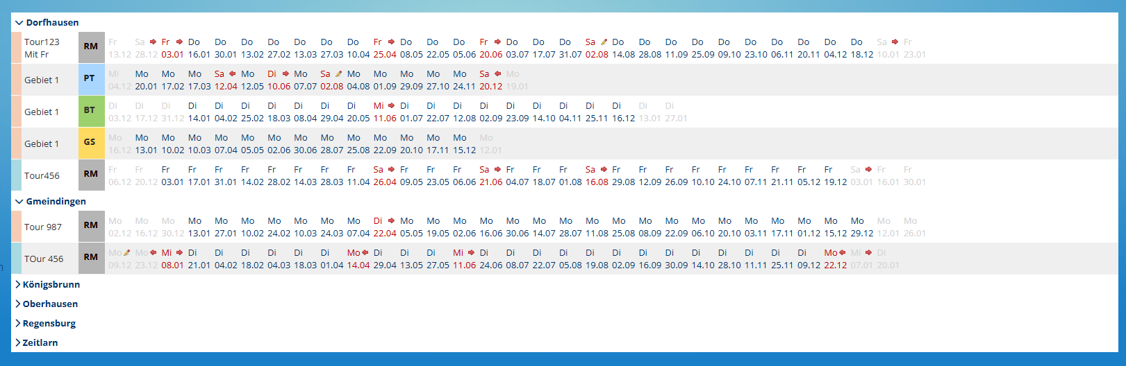 Dank der intelligenten Programmierung werden nun alle Informationen miteinander verknüpft und die Termine werden exakt nach dem angegeben Zyklus berechnet. Eine manuelle Kontrolle mit eventuellen Nachbesserungen (gerade bei vierwöchigen Leerungen) sichert die Qualität ab.