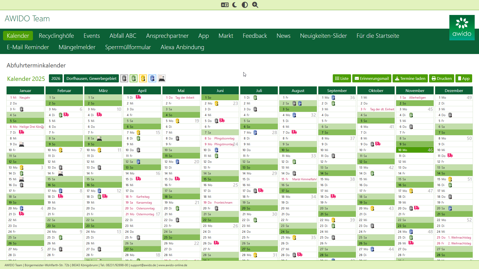 - Alternativ stellen wir auch eine kleine Web-Komponente bereit, über welche der Anwender Ort, Straße und Müll-Arten auswählen kann. Den notwendigen HTML-Code zum Einbinden der Auswahl-Komponente erhalten Sie über das AWIDO-Kundenportal.