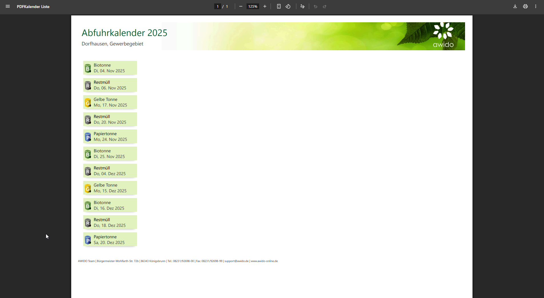 Der druckbare Abfuhrkalender liefert Ihrem Kunden einen A4-Kalenderausdruck, welcher aus Ihrer Web-Site als PDF-Datei geladen wird.