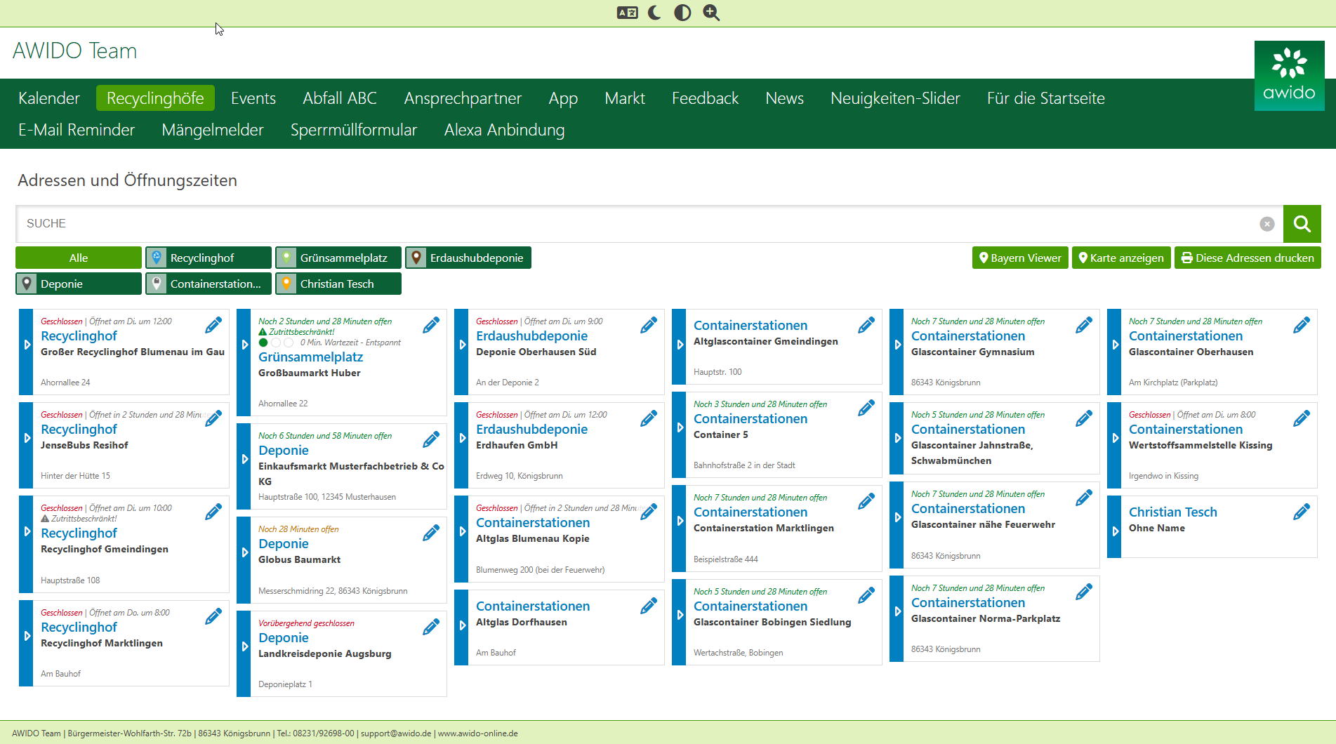 AWIDO kann beliebig viele Entsorgungseinrichtungen in den Kategorien Recyclinghof, Grünsammelplatz, Deponie, Erdaushub-Deponie oder Containerstation verwalten. Die Auswahl an Kategorien kann beliebig erweitert und angepasst werden (z.B. Farbe im Kalender, Art der Kartenpinns, etc.).