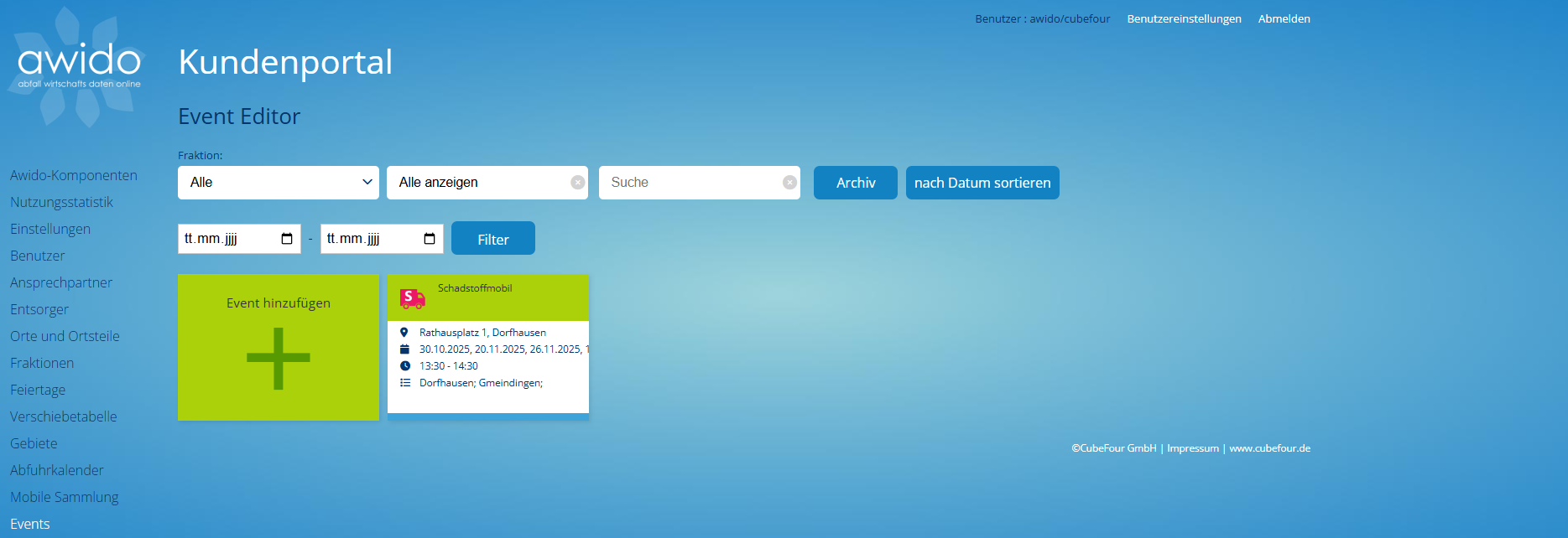 In der Ereignisübersicht im AWIDO Kundenportal werden alle Veranstaltungen mit ihrem aktuellen Status, durch farbliche Kennzeichnung, dargestellt.