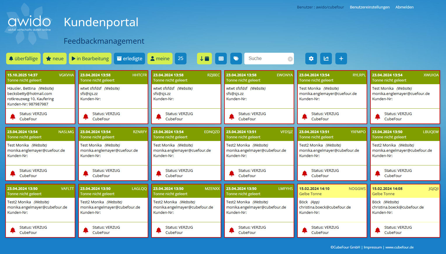 Der Feedbackmanager ist eine lösungsorientierte Kombination aus dem "Anliegenformular", das auf Ihrer Website oder in der AWIDO-App integriert wird und dem Feedbackmanager-Modul im Kundenportal, in dem alle eingegangenen Meldungen intelligent, teils automatisiert weiterverarbeitet werden.