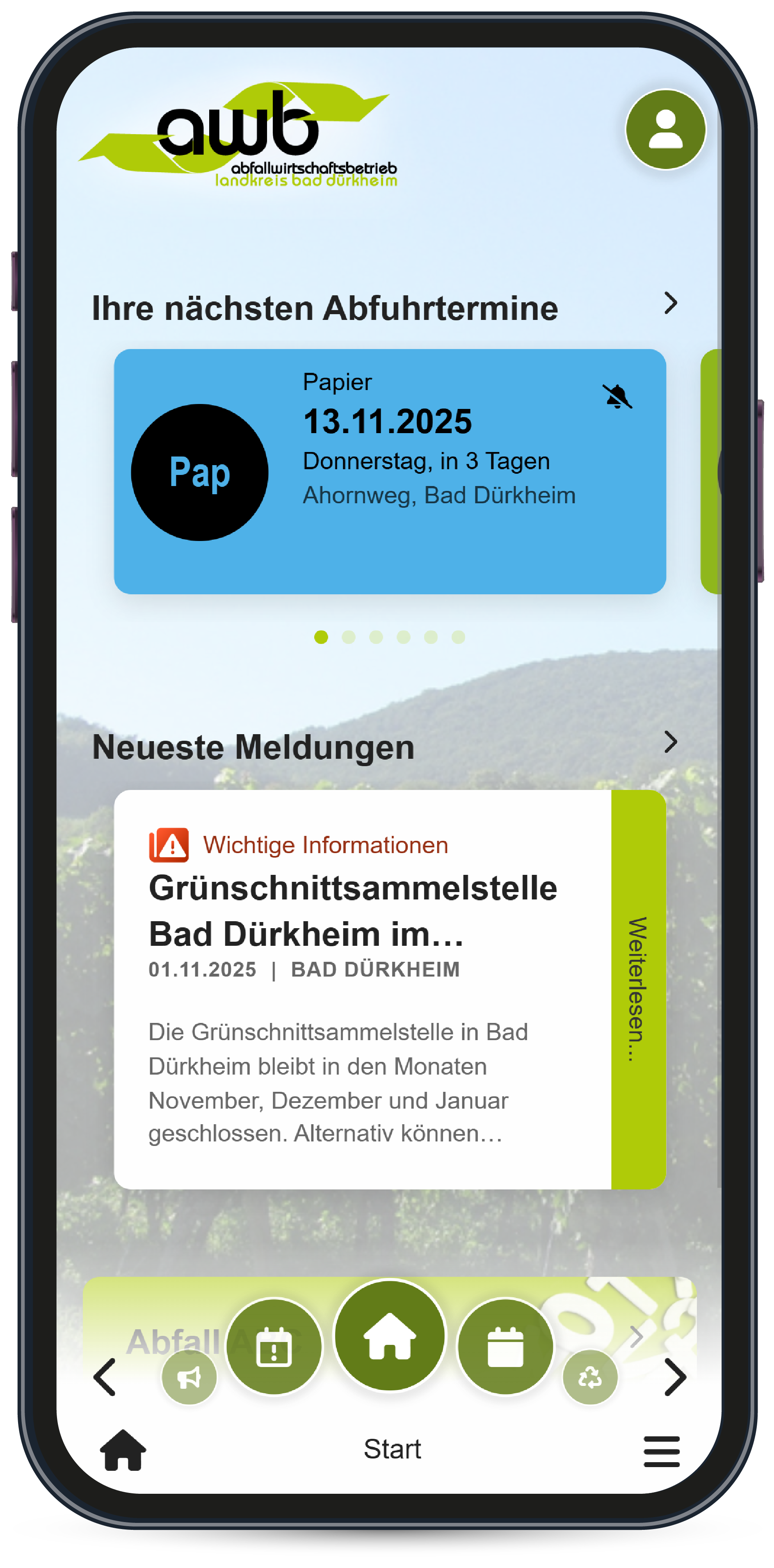Ab September 2016 gibt es für die Bürger des Abfallwirtschaftsbetrieb Landkreis Bad Dürkheim alle Informationen bzgl. der Abfallentsorgung in einer Anwendung. Hier können sie den eigenen Abfuhrplan als PDF ausdrucken, sich per E-Mail oder mit der App per Push-Benachrichtigung an die Abfuhr erinnern lassen, nachsehen wo der nächste Werstoffhof ist und wann er geöffnet hat.